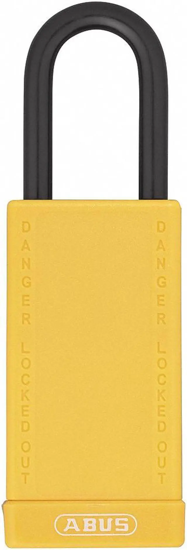 Lockout Padlock, Body Color Yellow, Body Height 3 in, Body Material Plastic-Covered Aluminum, Body Thickness 13/16 in, Body Width 1 9/16 in, Header Danger, Horizontal Shackle Clearance 3/4 in, Key Type Keyed Different, Non-Removable Key Yes, Resistance Properties Corrosion Resistant, Tamper Resistant, Shackle Diameter 1/4 in, Shackle Height 1 1/2 in, Shackle Material Steel, Shackle Type Open, Vertical Shackle Clearance 1 1/2 in, Width Across Shackle 3/4 in, Bumper Color Yellow. This item has been restricted from sale in the following state (s): []