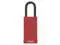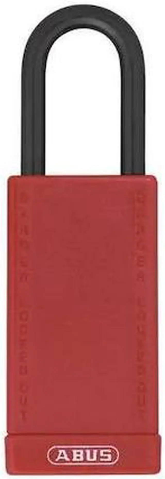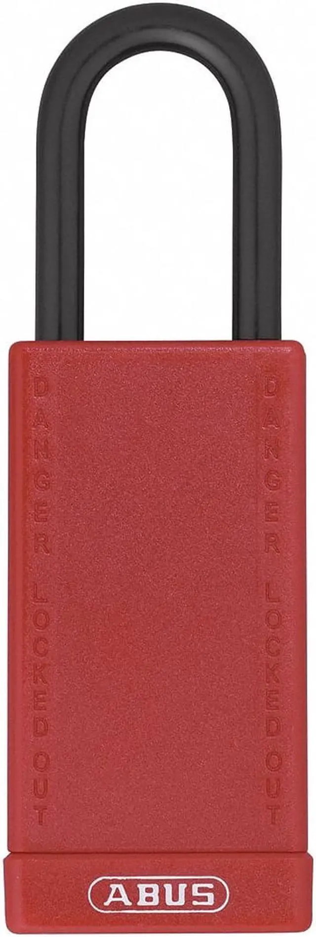 Lockout Padlock, Body Color Red, Body Height 3 in, Body Material Plastic-Covered Aluminum, Body Thickness 13/16 in, Body Width 1 1/2 in, Header Danger, Horizontal Shackle Clearance 3/4 in, Key Type Keyed Alike, Non-Removable Key Yes, Resistance Properties Corrosion Resistant, Tamper Resistant, Shackle Diameter 1/4 in, Shackle Height 1 1/2 in, Shackle Material Steel, Shackle Type Open, Vertical Shackle Clearance 1 1/2 in, Width Across Shackle 3/4 in, Bumper Color Red. This item has been restricted from sale in the following state (s): []