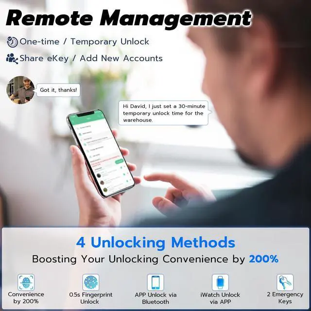 | Special Features | eSmartlock App for Phone & iOS Watch, authorize users period and schedule, review record, Keys |