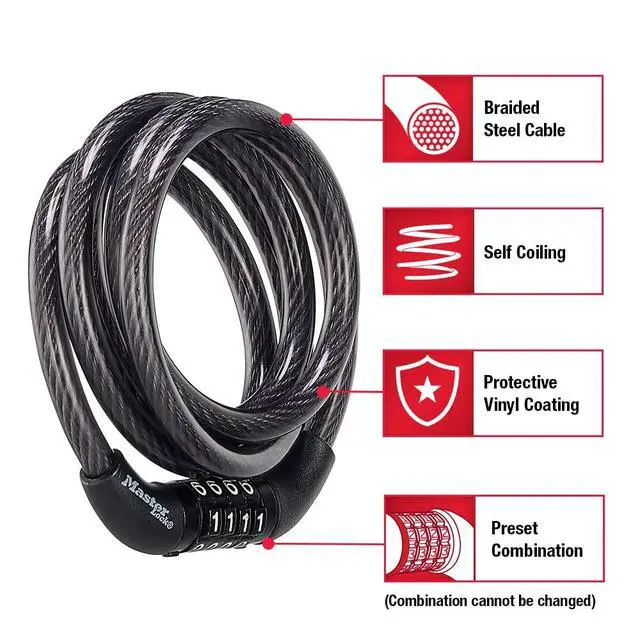 Cable bike lock features a preset, four-digit combination lock; Provides a basic security level that is best used as a theft deterent; The same combination is used for both bike lock cables