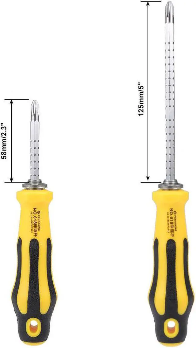 1. The Adjustable Length screwdriver features a shaft that adjusts within 2.3 inch - 5 inch (58-125mm) for numerous length choices.