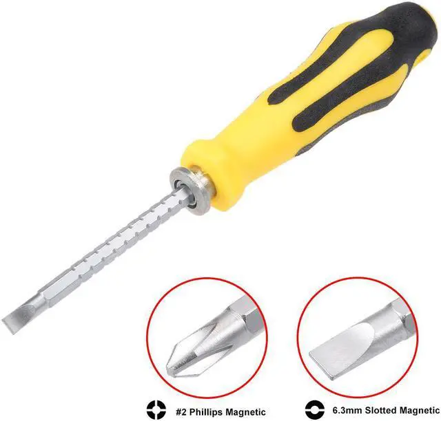 3. This versatile multi-length and multi-bit driver features #2(PH2) Phillips and 6.3mm Slotted tip for multiple screwdrivers in one tool.
