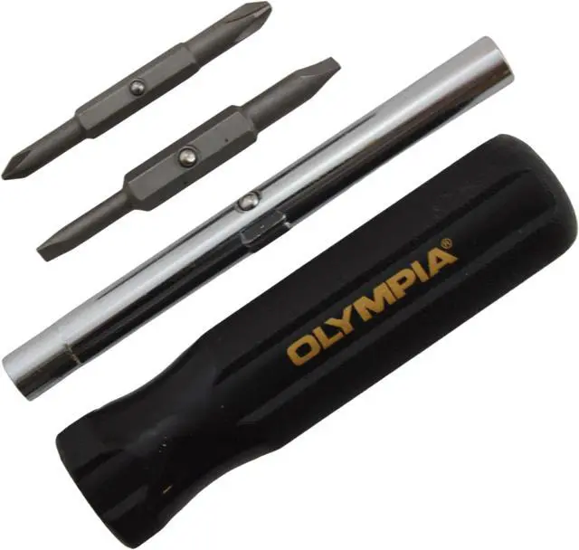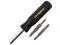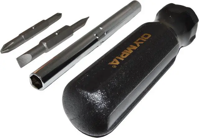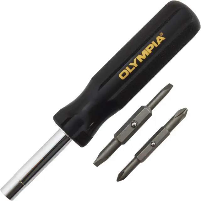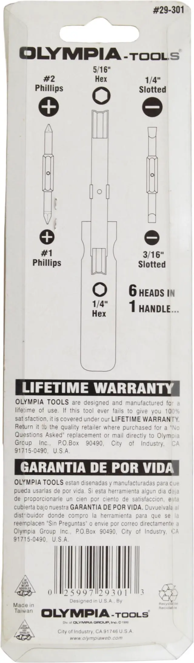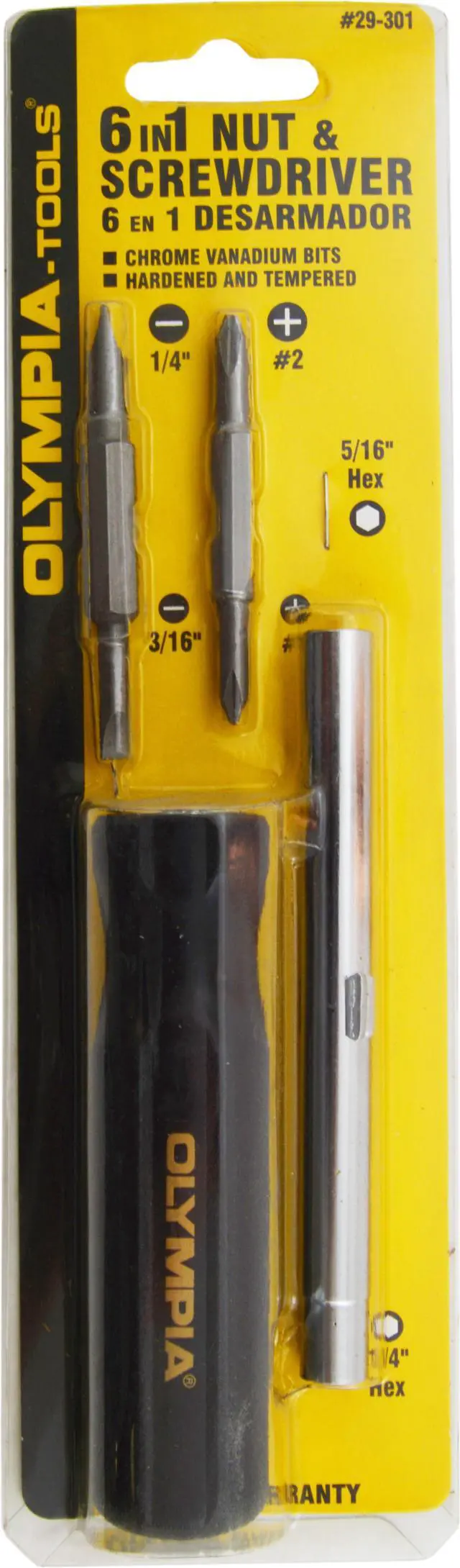 6-in-1 nut and screwdriver with hardened and tempered chrome vanadium bits: 1/4" and 3/16" Slotted #1 and #2 Phillips 1/4" and 5/16" Hex nut drivers built into both sides of the shaft