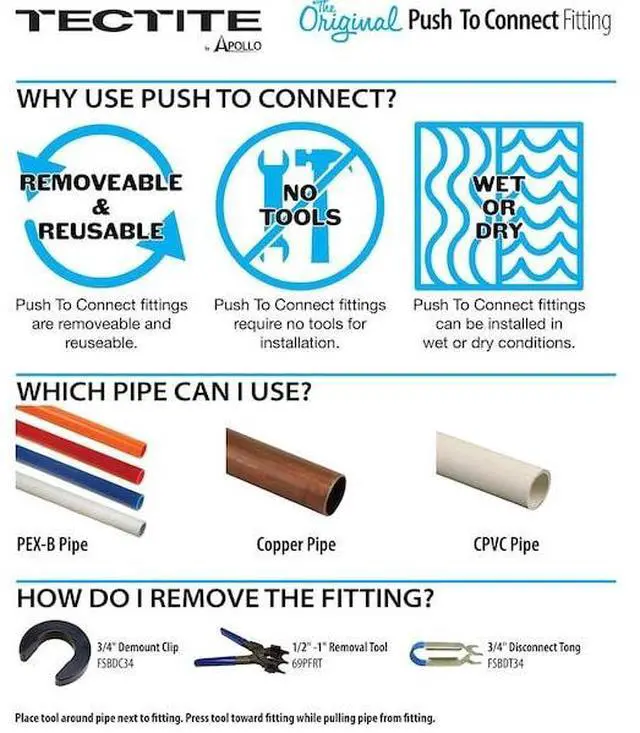 California Proposition 65: This product contains a chemical known to the State of California to cause birth defects or other reproductive harm. The Tectite by Apollo is the fastest, cleanest and simplest way to install or replace a valve on copper, CPVC, PE-RT and PEX piping systems without the use of tools, solder, open flame or glue. It allows for simple control of water flow in hydronic and potable water systems and the side vent allows for the expulsion of air or water for testing, repair or weatherization situations. Simply insert the pipe to allow the high-strength stainless steel teeth to grip the pipe securely against the specially designed O-ring. Fitting removal and reuse is just as simple using a simple demount clip (sold separately). After assembly, valves may be rotated for simpler installation in tight spaces.