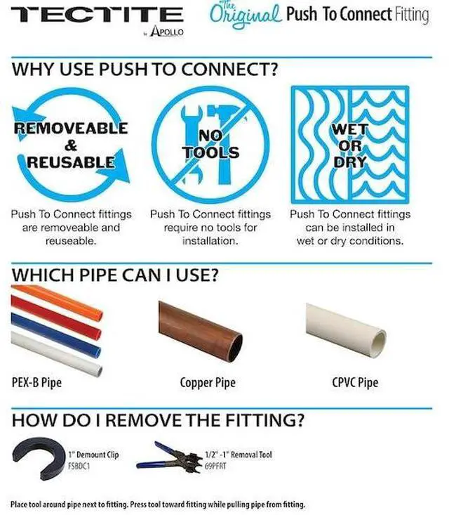 California Proposition 65: This product contains a chemical known to the State of California to cause birth defects or other reproductive harm. The 1 in. Tectite by Apollo Push-To-Connect Elbow is the fastest, cleanest and simplest way to create a 90 joint of any combination of copper, CPVC, PE-RT and PEX pipe without the use of tools, solder, open flame or glue. Simply insert the pipe to allow the high-strength stainless steel teeth to grip the pipe securely against the specially designed O-ring. Fitting removal and reuse is just as simple using a simple demount clip (sold separately). After assembly, fittings may be rotated for simpler installation in tight spaces. All Tectite by Apollo fittings are approved for use in both potable water and hydronic heating piping systems.