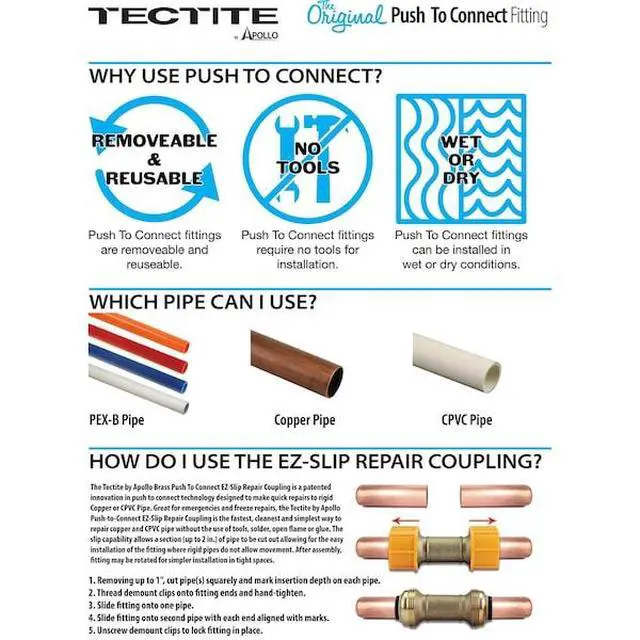 California Proposition 65: This product contains a chemical known to the State of California to cause birth defects or other reproductive harm. The Tectite by Apollo Brass Push-To-Connect EZ-Slip Repair Coupling is a patented innovation in push-to-connect technology designed to make a quick repairs to rigid Copper or CPVC Pipe. Great for emergencies and freeze repairs, the Tectite by Apollo Push-to-Connect EZ-Slip Repair Coupling is the fastest, cleanest and simplest way to repair copper and CPVC without the use of tools, solder, open flame or glue. The slip capability allows a section (up to 2 in. ) of pipe to be cut out allowing for the easy installation of the fitting where rigid pipes do not allow movement. Simply thread the included demount clips on either end of the fitting until they resist further tightening. Slide the slip coupling on to the pipe covering the leak point or position the slip coupling so that it either pipe is fully inserted into the fitting. Finally, turning counter-clockwise, remove the threaded demount clips which will allow the stainless steel grip teeth to bite the pipe and provide a leak free connection.