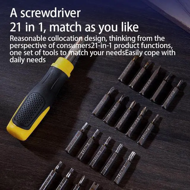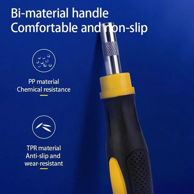 1. Two-color bi-material handle made of Engineering material PP and high-grade TPR for comfortable and soft grip 2. Packed with TPR box for easy storage 3. Cr-V alloyed steel bits with heat treatment and chrome-plated surface for rust proof