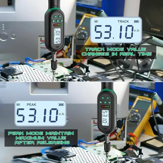 This electrician torque screwdriver offers two different modes: TRACK and PEAK. In TRACK mode, you can see the change of torque value at any time, and in PEAK mode, it can record the maximum torque value for you during use. The electrician torque screwdriver also offers four different unit modes: Kg. cm, N. m, In. lb, Ft. lb. You can switch between them at any time.