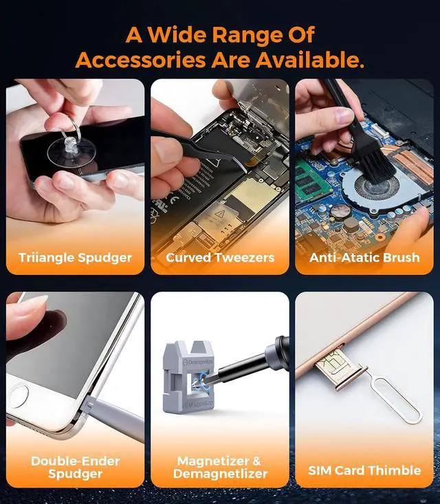 [52in1 Repair Tool Kit] This all-in-one tool set includes 11 accessories in 6 different categories and 40 different types of screwdriver bits. In addition to removing screws it can be used for cleaning electronic devices and assisting with repairs. You will no longer need to find other tools when disassembling phone casings or cleaning computer fans. [Durable & Environmentally Friendly] Both accessories and housing are processed from PHA material with new manufacturing technology improving the products durability and eco-friendliness. During phone disassembly pry bars often break or triangle picks cannot support the disassembly force. This 52-in-1 cleaning and repair set perfectly solves these problems.