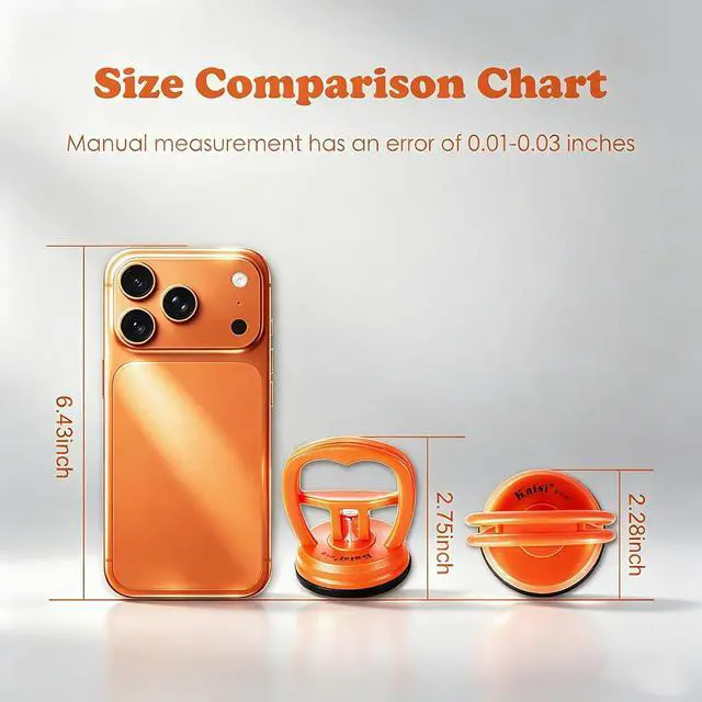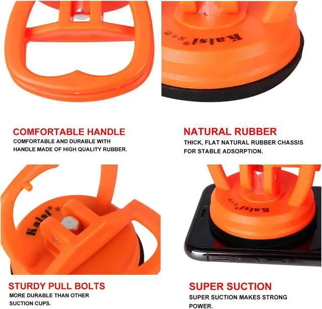 Weight limit??: Designed for lightweight items (up to 1-2kg) such as phones or tablets. Electronic Screen Repair Tool Kits - 2 x 2.25 inch Suction cup. The suction cup is a great screen repair tool. In addition this suction cup can be used as the cell phone holder. Strong Suction Cup - This suction cup set includes 2pcs small suction cups. The mini suction cup is made of durable ABS and natural rubber material long service life. The handle of the suction cup is made of solid ABS the soft rubber pad is gentle on screen and wont scratch the paint. Easy to Use and Clean - When you need to disassemble the LCD screen of a mobile phone or first heat the adhesive bonding areas to loosen them. Then keep the suction cup together well with the screen fold down the suction cup handle squeeze handle closed for suction to open the screen. It is also easy to clean you just clean and heat the mini with hot water.