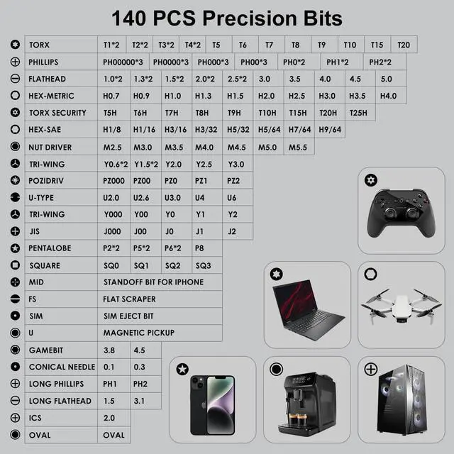 | Head Style | Phillips,Flathead,Torx,Torx Security,Hex-Metric,Hex-Sae,Pentalobe,Nut Driver,Triangle,Tri-Wing,Tri-Wing,JIS,Pozidriv,U-Type,Square,Gamebit,Oval,ICS,U,SIM,Conical Needle,FS,Mid |