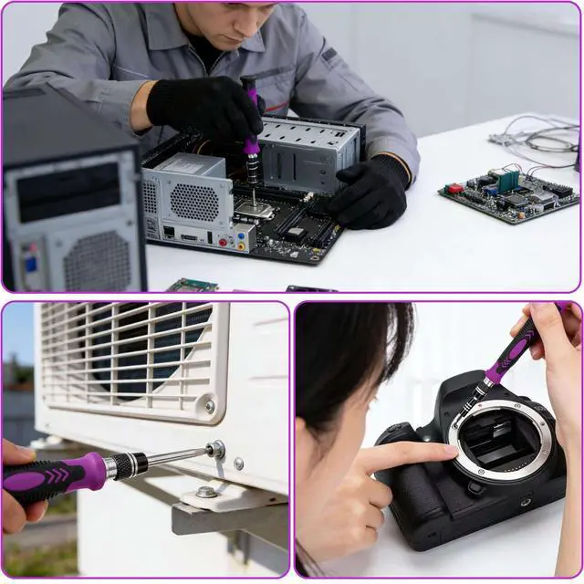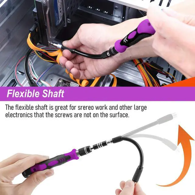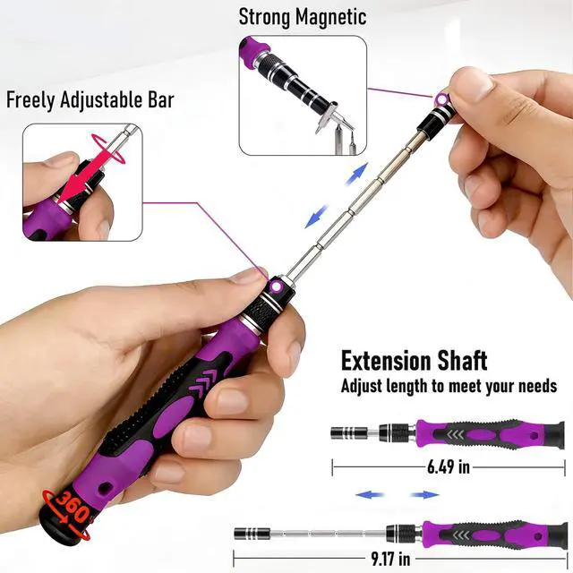 Multifunctional AccessoriesThis screwdriver set is professionally designed with 17 accessories to maximize your repair capabilities.Equipped with a universal hose.pry bar, triangular pry blade, tweezers, suction cup, SIM card pin,removable magnetizer,adapter for electric screwdrivers