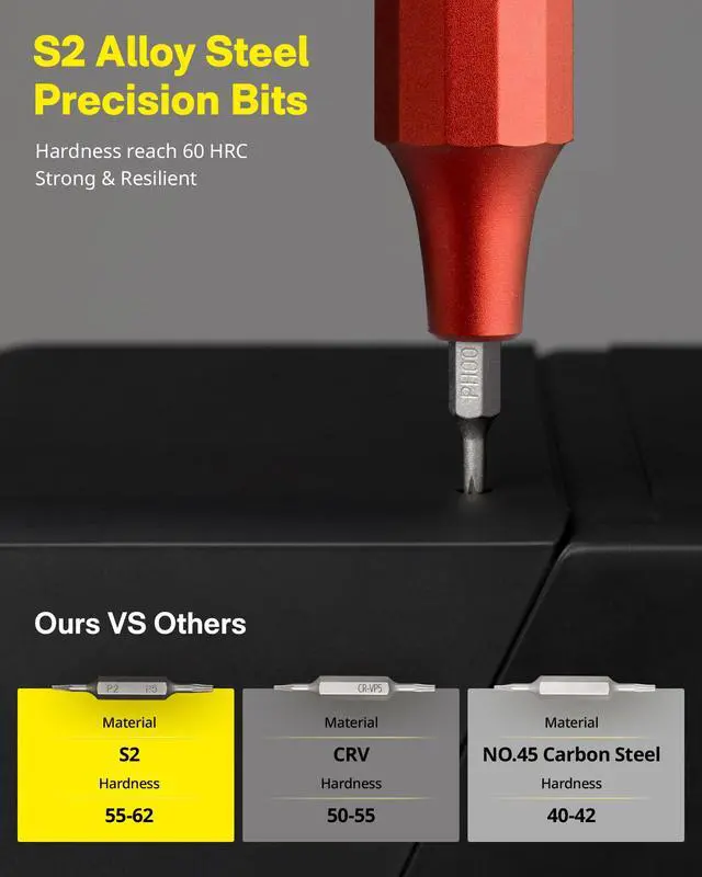 1. 24 S2 Steel Precision Bits: Includes 12 double-ended bits, high-quality S2 steel bits with a hardness of up to 60HRC, ensuring durability and compatibility with various screw types and sizes. Includes the following models philips (PH000, PH00, PH0, PH1), flat blade (SL1.5, SL2.0), hex (H1.5, H2.0, H2.5), torx (T2, T3, T4, T5H, T6H, T8H, T9H, T10H), U-shaped (U2.6), Y-shaped (Y0.6), W-shaped (W1.5), Tri-Wing (TW1), Triangular (2.3), Pentagon (P2, P5) bits.