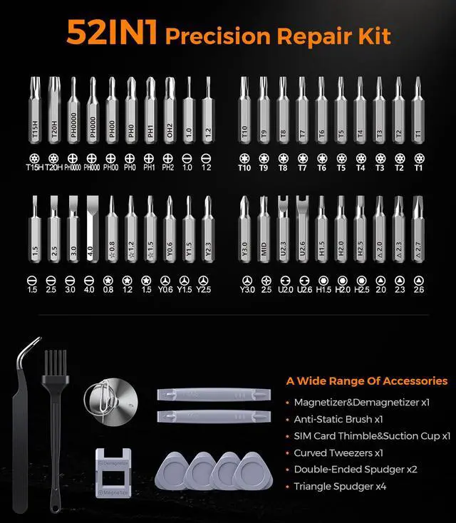 [52in1 Repair Tool Kit] This all-in-one tool set includes 11 accessories in 6 different categories and 40 different types of screwdriver bits. In addition to removing screws, it can be used for cleaning electronic devices and assisting with repairs. You will no longer need to find other tools when disassembling phone casings or cleaning computer fans.