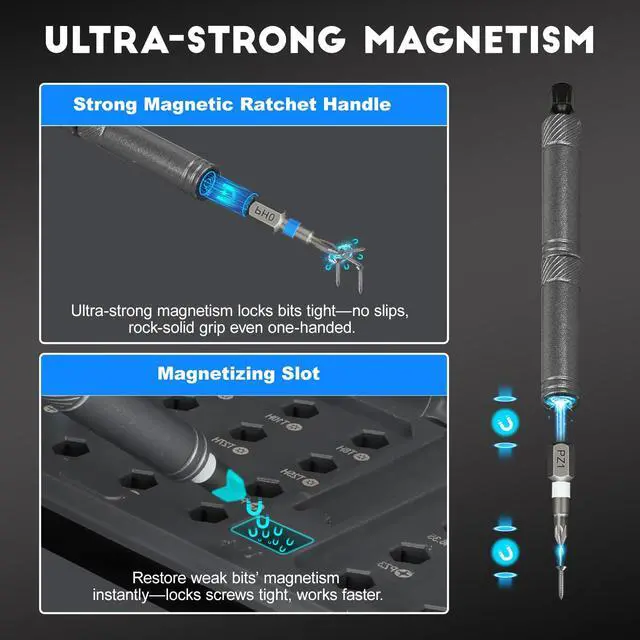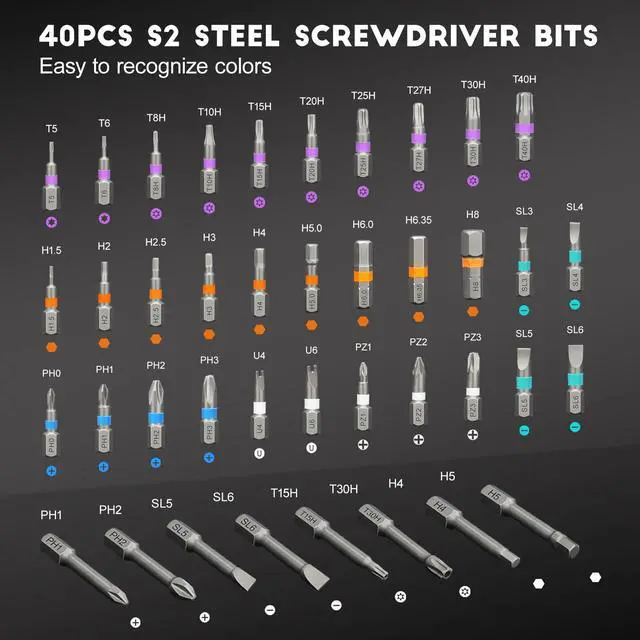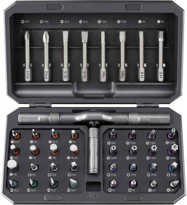 42 in 1 Magnetic Screwdriver SetThis ratchet screwdriver set includes 8 pcs 45mm long screwdriver heads and 32 pcs 25mm short screwdrivers (PH, SL, Torx, Hex, PZ, U-shape etc.). The ratcheting screwdriver set also includes an ergonomic T-handle for a comfortable grip. The magnetic ratchet screwdriver set is an ideal tool kit for home, work, DIY projects, and professional tasks, screwdriver for eyeglasses, electronics, ring doorbell, tight spaces, furniture assembly, home appliance maintenance, pc, glasses, watch, bicycle, and more.
