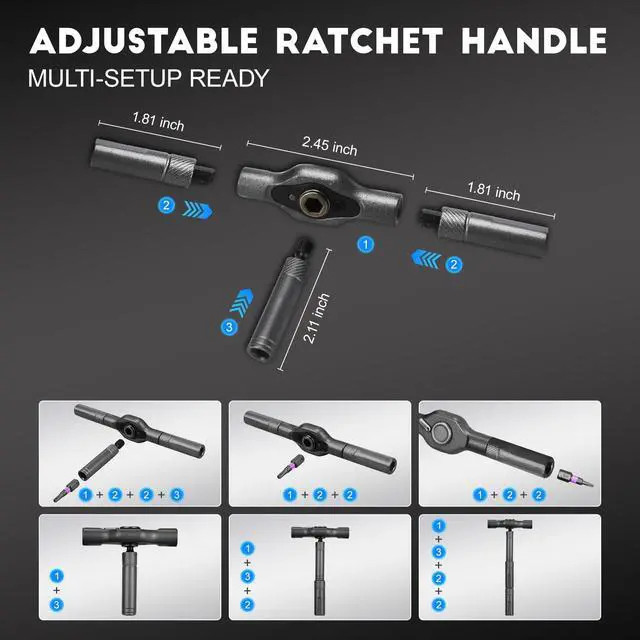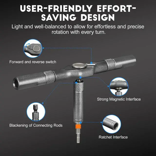 T Handle Ratchet ScrewdriverThis ratchet screwdriver set features an innovative removable ratchet handle. Its versatile modular design allows for multiple configurations to adapt to various scenarios, such as working in tight spaces. The ergonomic handle is lightweight yet sturdy, enabling you to drive and remove screws with ease, saving time and effort.