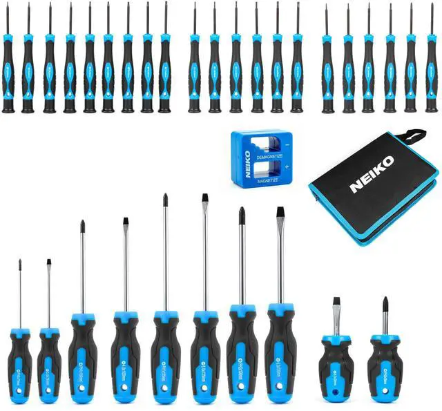 This magnetic screwdriver set with zip up case includes 32 pieces, combining a standard and a precision set of screwdrivers providing a comprehensive solution for all your screwdriving needs.