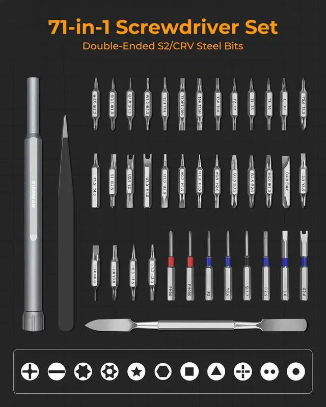 Wide Applications XIAONIAN micro screwdriver set include 30pcs H4*28mm double-ended S2/CRV steel bits, 8pcs H4*39mm colored extended magnetic bits (Star, Phillips, Pentalobe, Torx, Hex,Slotted, Triangle, Square and other types) 1 pc tweezers and 1 pc crowbar. The precision screwdriver set can be used to repair electronics, phone, computer, pc, laptop, macbook, pc5, xbox controller, watch, glasses, camera, toy, model, and more. Tool Gifts for men.
