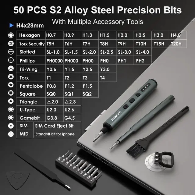| Included Components | Electric Screwdriver, 50 PCS S2 Bits, Manual Screwdriver, Opening Picks, Suction Cup, Pry Tools, Pointed Tweezers, Hook Tool, Cleaning Brush, Charging Cable, Built-in Magnetizer/Demagnetizer |