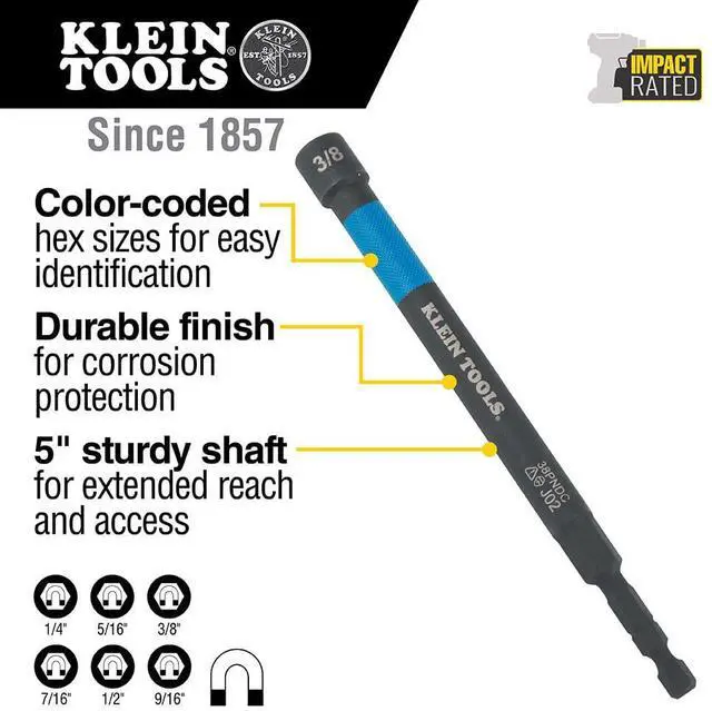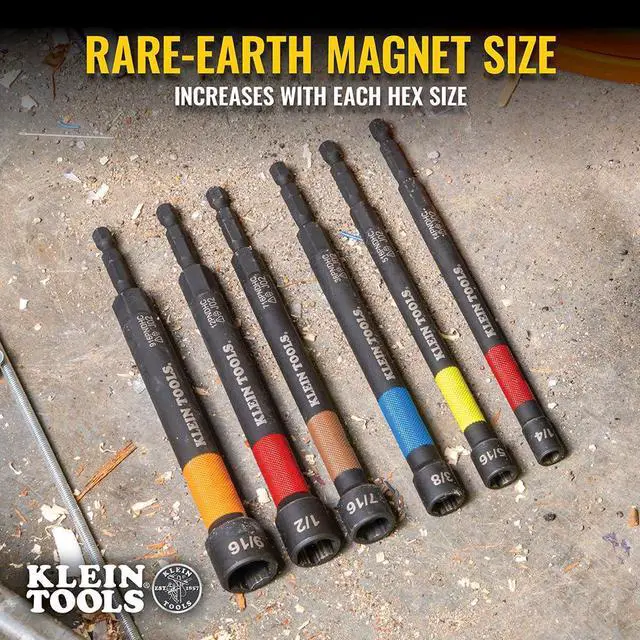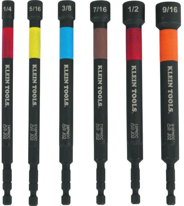 Klein Tools' Magnetic Color-Coded Power Nut Setters are designed with the professional in mind. Each nut setter is made of high-grade impact steel and is color coded for easy identification. The nut setters contain Rare-Earth magnets to securely hold fasteners, and are also extra long for reach into recessed areas.