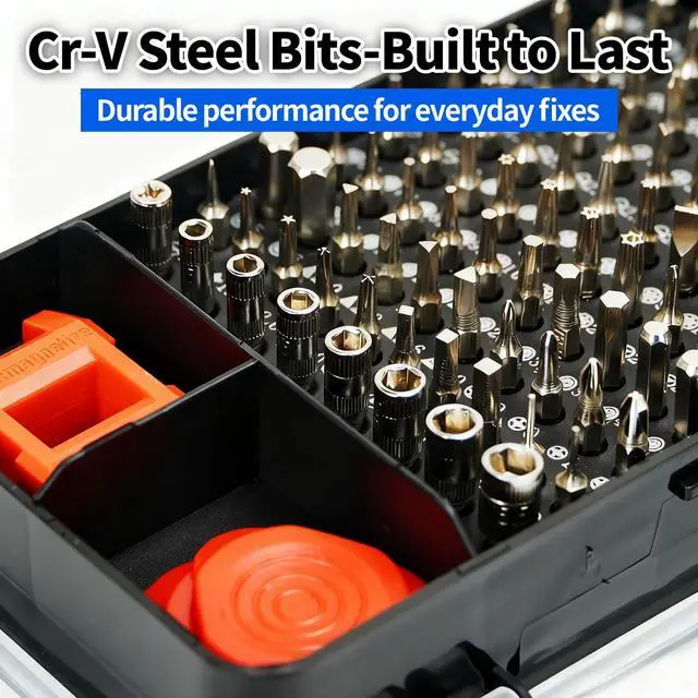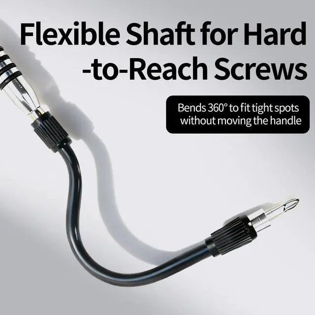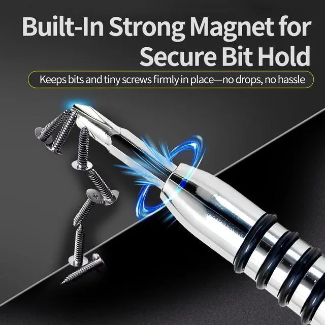 Durable CR-V Steel & Ergonomic HandleMade with premium CR-V steel bits for superior hardness and wear resistance. The magnetic screwdriver handle features a smooth-rotating cap and extendable shaft, providing better control and easier access to tight or deep repair areas