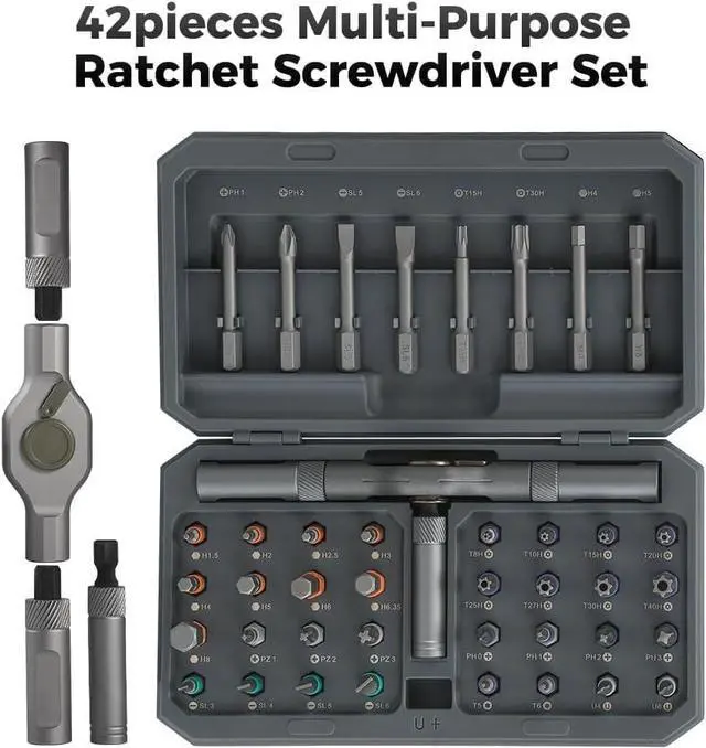 42-in-1 Multi-Bit Screwdriver Set for Versatile Use: This comprehensive set includes 40 high-quality S2 magnetic chrome-molybdenum alloy steel bits (6.35mm/1/4") and a durable aluminum alloy handle. Perfect for home improvement, DIY projects, and repairs, it features 32 short bits (25mm) and 8 long bits (45mm) in various types (PH, SL, Torx, Hex, PZ, and U-shaped). The heat-treated bits ensure hardness, toughness, and resistance to wear, making it ideal for both professional and household tasks.