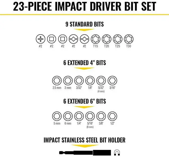 The Klein ProFlex Impact-Rated Ratcheting T-Handle was designed for the professional tradesman and do-it-yourself enthusiasts. Set includes 9 standard bits, 12 extended bits, impact bit holder and ratcheting T-Handle. The bits are made of high-impact rated S2 steel and feature an optimized torsion zone that absorbs impact forces to increase the lifetime of the bit.