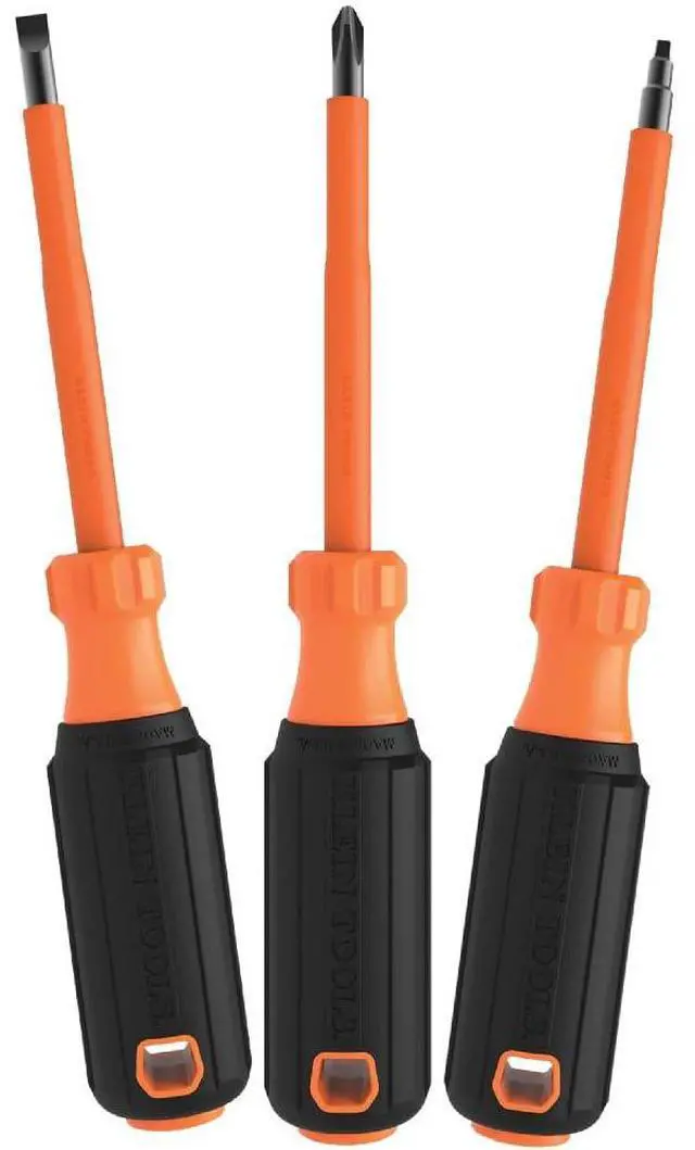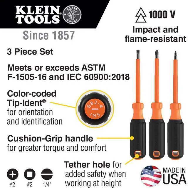 This 3-Piece Made in the USA Insulated Screwdriver Set features assorted Klein Tools' screwdrivers. Each is individually tested to exceed the IEC 60900 and ASTM F1505 standards for insulated tools. Two layers of insulation provide protection against electric shock.