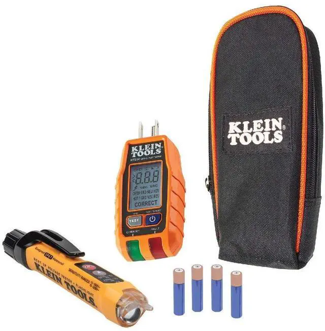 Klein Tools Premium Electrical Test Kit (Cat. No. RT250KIT) includes an electrical receptacle tester with LCD and a non-contact voltage tester with flashlight.
