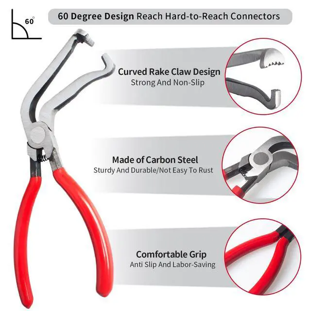 Our automotive electrical disconnect pliers are made from high-carbon steel that is sturdy durable and not easy to rust or damage. The robust build ensures that couplers can be disconnected without causing wear to the tool itself. And the handle is made by plastic coated that is anti slip, comfortable and labor-saving.