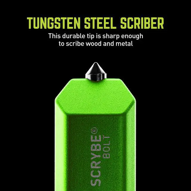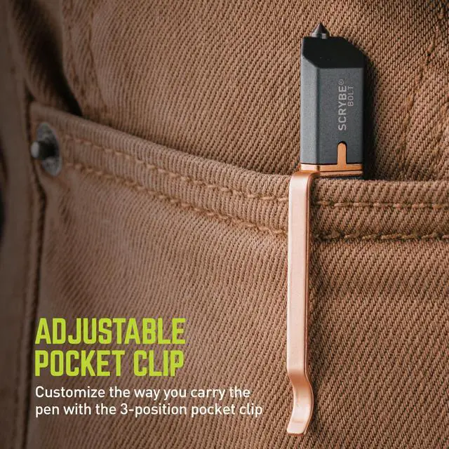 The SCRYBE BOLT 8-in-1 Multi-Tool Pen features a ballpoint pen with bolt-action deployment, rulers, bubble level, 2 micro screwdrivers housed within a removable Tungsten steel tip that serves as a glass breaker, scribe, and box opener. With its unique triangular design and 3-position adjustable clip, the SCRYBE BOLT delivers a customizable writing experience with a variety of easily accessible tools.