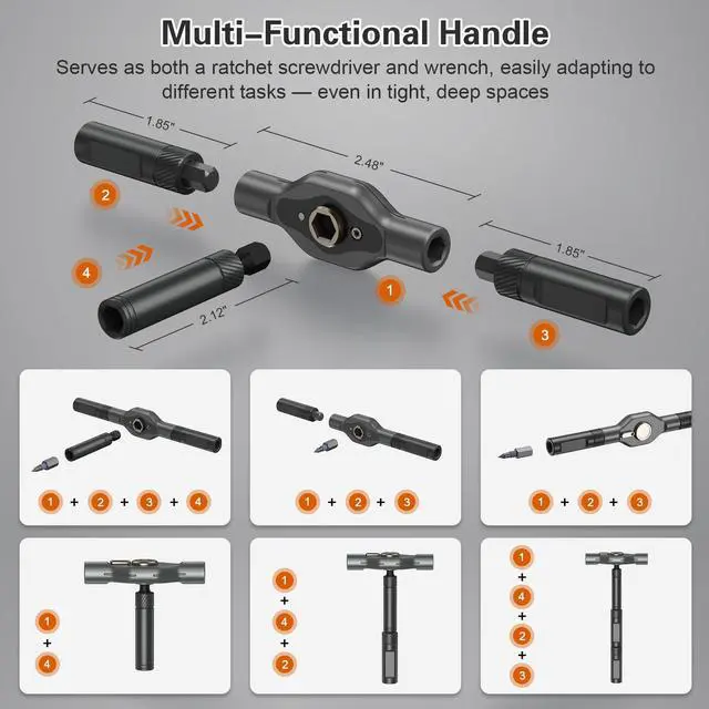 This tool effectively handles a variety of tasks, including home appliance repairs, furniture assembly, and repairs on computers, motorcycles, bicycles, and cars. It features a multi-position handle that can be easily adjusted for different tasks, even in tight or narrow spaces.