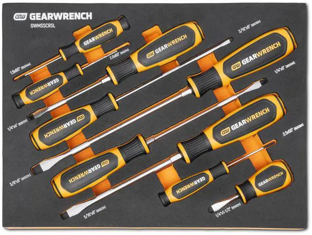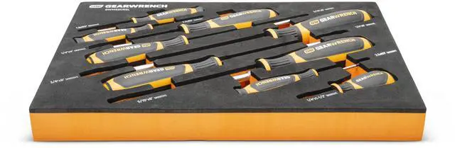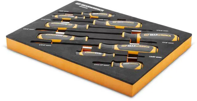 GEARWRENCH mechanics tools have been designed with professional users in mind for better productivity, access, and strength. The 9 piece slotted dual material screwdriver set in a foam storage tray is one of the wide collection of GEARWRENCH Modular Sets. These chemical and solvent resistant foam trays are designed to fit in a wide range of tool storage systems, including our GSX storage line of products. The foams are in contrasting orange and black with high visibility size markings for easy tool identification. Each of the tools fits in a custom cutout that provides optimal protection, organization, and accessibility.