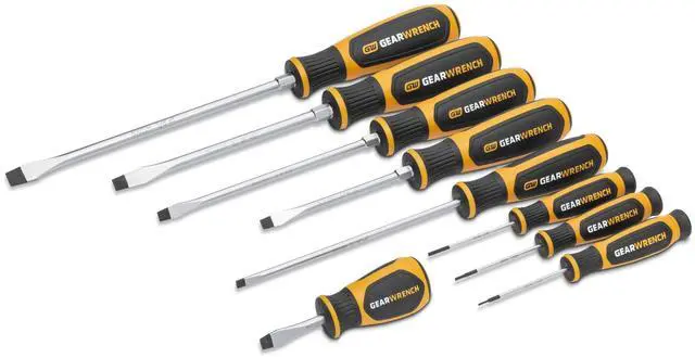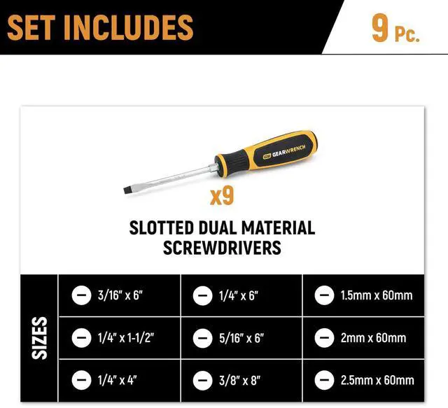 | Head Size | (6) Slotted Dual Material Screwdrivers: 3/16" x 6", 1/4" x 1-1/2", 1/4" x 4", 1/4" x 6", 5/16" x 6", 3/8" x 8"; (3) Mini Slotted Dual Material Screwdrivers: 1.5mm x 60mm, 2mm x 60mm, 2.5mm x 60mm |