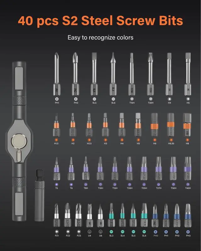 This magnetic screwdriver set includes 40PCS S2 chrome molybdenum steel bits for durability and an easy-to-identify color ring design for efficiency. Different bits are available for professional use as well as for everyday tasks at home, work, DIY projects and maintenance, making them easy to use in any situation.