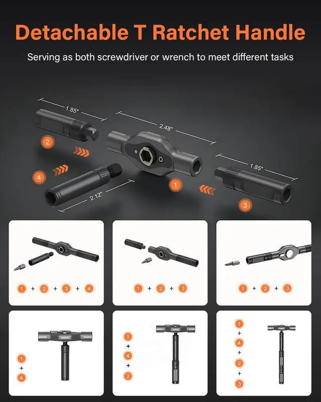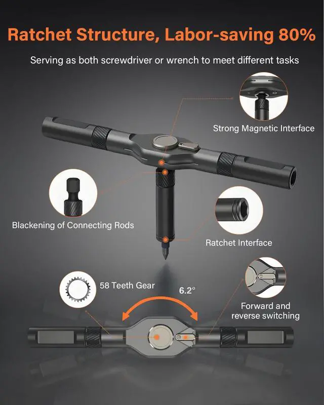 The handle of the screwdriver is made of super-hard hot forged aluminum alloy, molded by precision CNC injection molding, durable, oxidation-resistant, and comfortable to hold, ensuring that you won't feel fatigue when using it for a long time. With 58 teeth forward and reverse ratchet structure, 6.2 degree ratchet design, 80% labor saving!