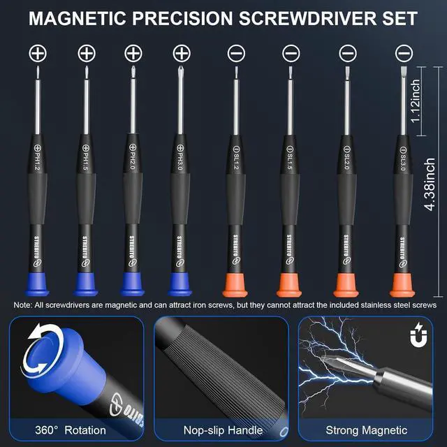 Magnetic Screwdriver Set: This eyeglass repair kit includes 8 screwdrivers (4 Phillips and 4 flathead) suitable for repairing eyeglasses, watches, phones, and laptops. The ergonomic handles feature a non-slip grip and a rotating top for comfortable, effortless use. A key note: the included stainless steel screws are non-magnetic, but the screwdriver tips themselves are magnetic for handling standard screws in other devices