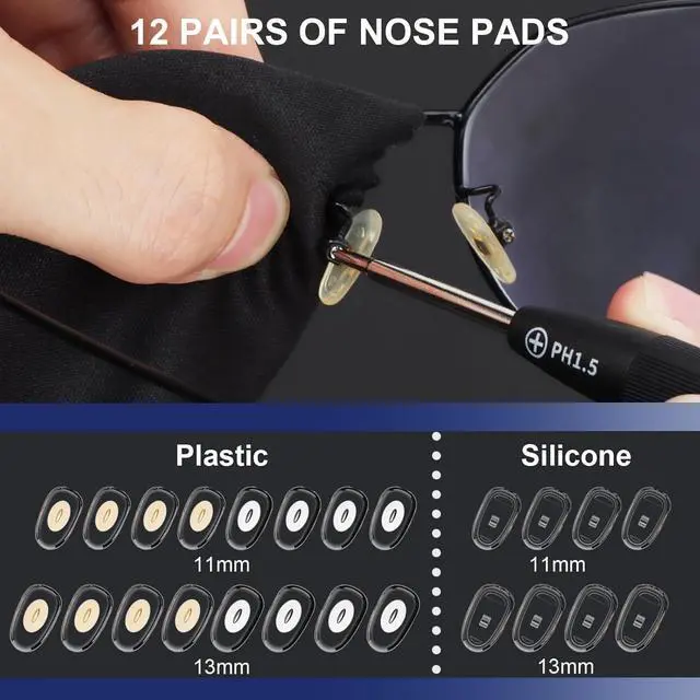 Various Nose Pads: The eyeglass repair kit with screws includes 12 pairs of high-quality nose pads for glasses (11mm & 13mm), so you can find your perfect fit. You'll get 4 pairs of silver plastic, 4 gold plastic, and 4 soft silicone nose padsall designed for all-day comfort and a secure grip. Perfect for replacing worn or uncomfortable nose pads on your glasses or sunglasses