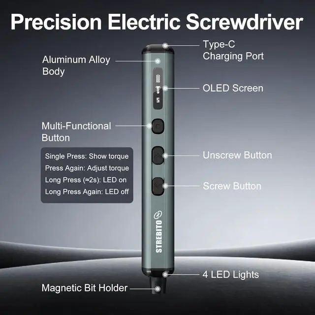 Ergonomic Handheld DesignDesigned like a magnetic micro pen, the mini power screwdriver fits comfortably in hand, with an anti-slip grip for prolonged use, easy forward/reverse switch for tightening or loosening screws, 4 built-in LEDs to illuminate dim corners, and a clear OLED display showing torque settings and battery life, ideal for small electronic device repair and detailed PC building tasks