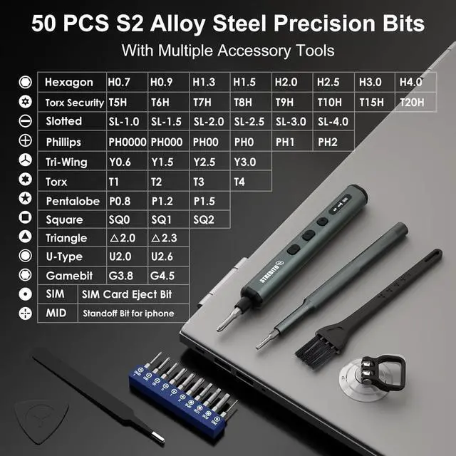 Comprehensive 50-Bit Set & ToolsThis electric screwdriver set includes 50 precision S2 bits covering Phillips, Torx, Torx Security, Slotted, Hex, Tri-Wing, Pentalobe, Triangle, SQ, U-Type, G-Type, MID, and SIM pin, plus a built-in magnetizer, tweezers for micro components, pry tools, hook tool, suction cup, and cleaning brush, ensuring all common electronic repair needs are met in one complete, portable kit