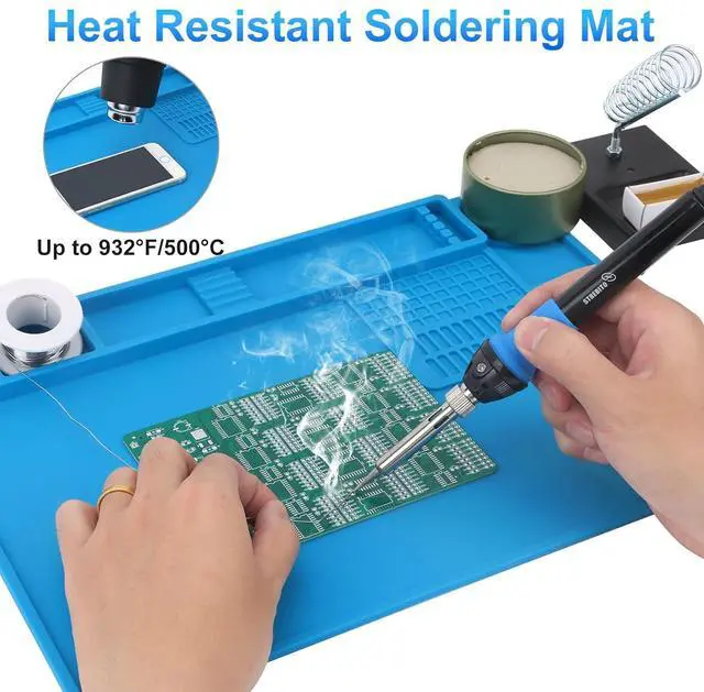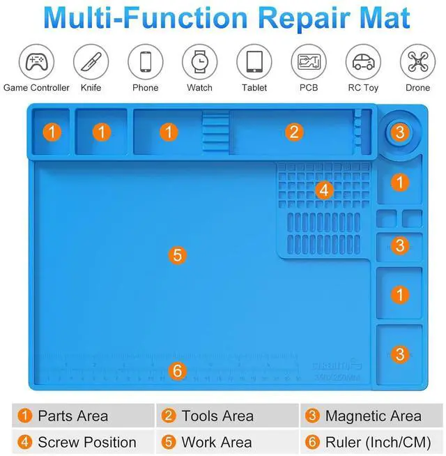 Wide Application: At 13.78 x 9.84 inches, this solder mat provides ample space for soldering and repairing various electronics, such as watch, iPhone, and RC drone. It's also a practical gift for DIY enthusiasts, technicians, and professionals. The repair mat features 3 magnetic zones for metal components and screws, and non-magnetic zones to protect precision parts from magnetic interference
