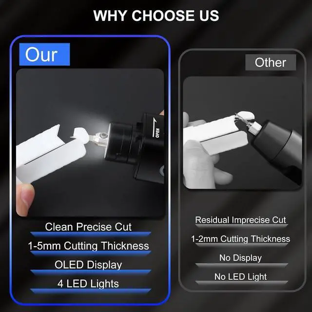 Smart Dual OLED Display: The real-time screen shows cutting mode, temperature, and frequency. The animated interface keeps you informed of every operation and gear change. The integrated 4 LED lighting illuminates the work area brilliantly, making it much easier to see fine details and ensure accuracy