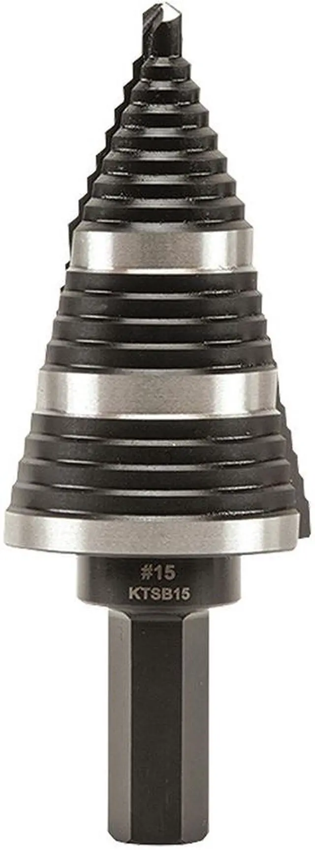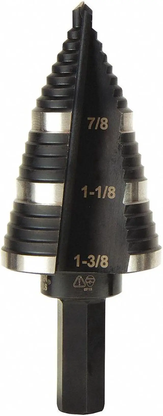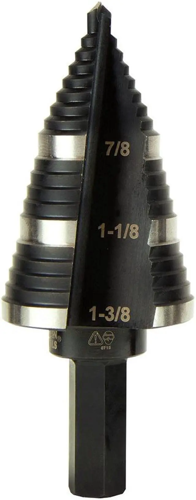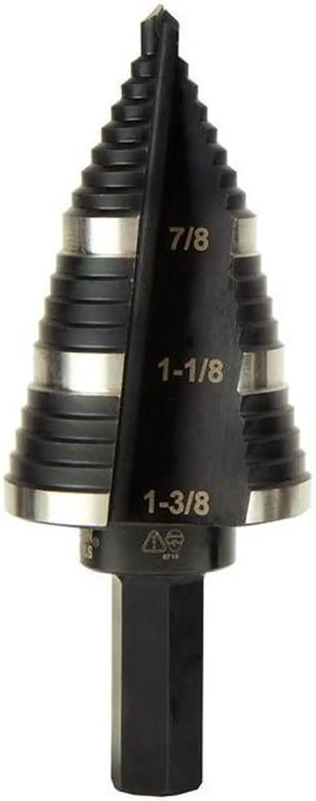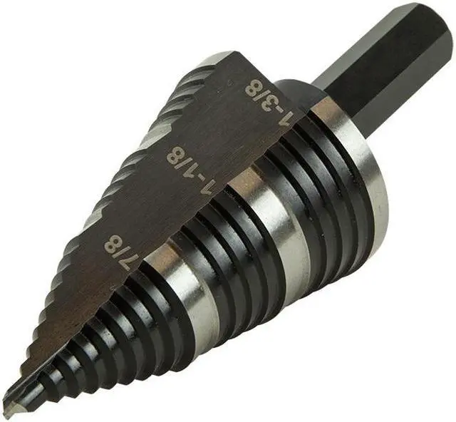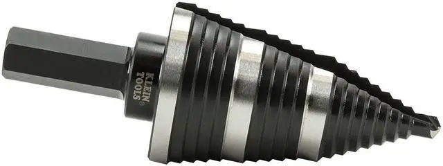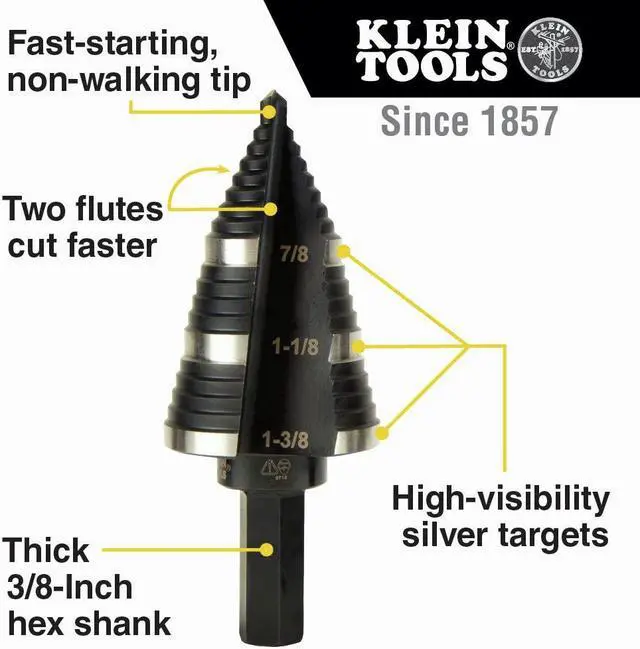 Straight, Double Fluted Step Drill Bits from Klein Tools provide cleaner cutting and drilling. The aluminum titanium coating is 10 times more durable than steamed black oxide for longer bit life. 3/8-Inch hex shank is durable, and has a firm, positive grip. Laser-etched markings provide quick size identification on primary holes. This step bit has 3-hole sizes from 7/8-Inch to 1-3/8-Inch (22.2 to 34.9 mm).