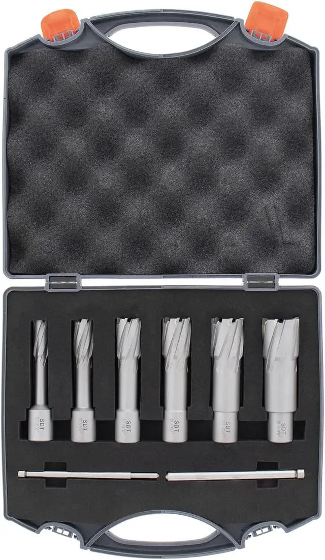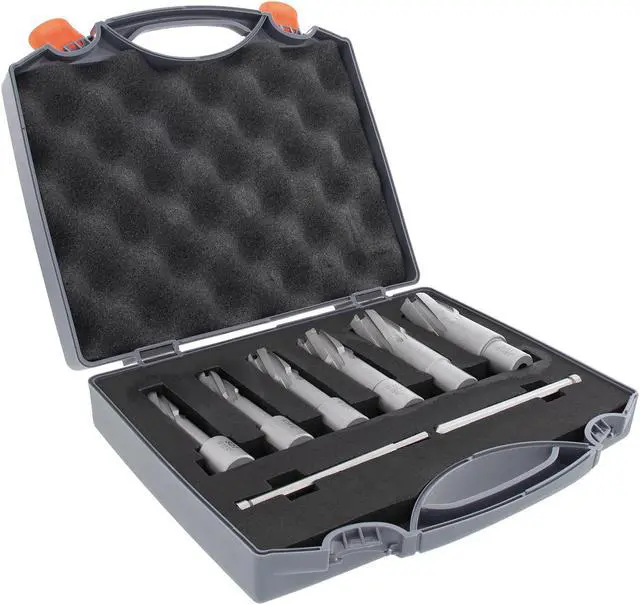 - Kit includes six (6) carbide-tipped annular cutters and (2) pilot pins.