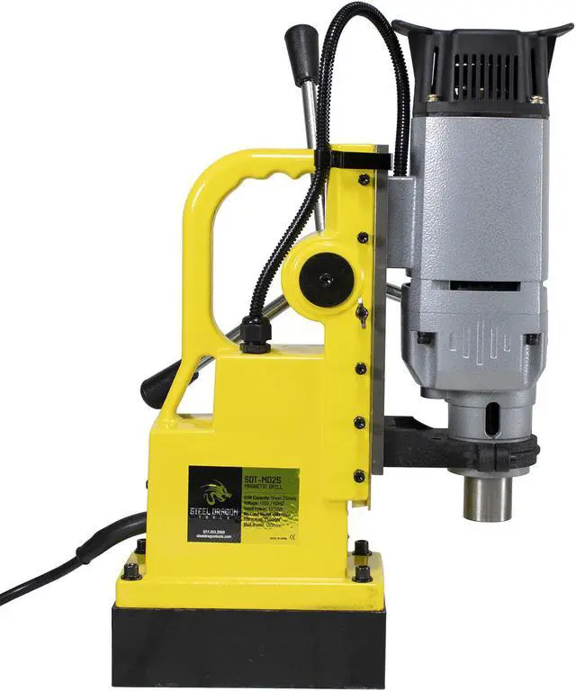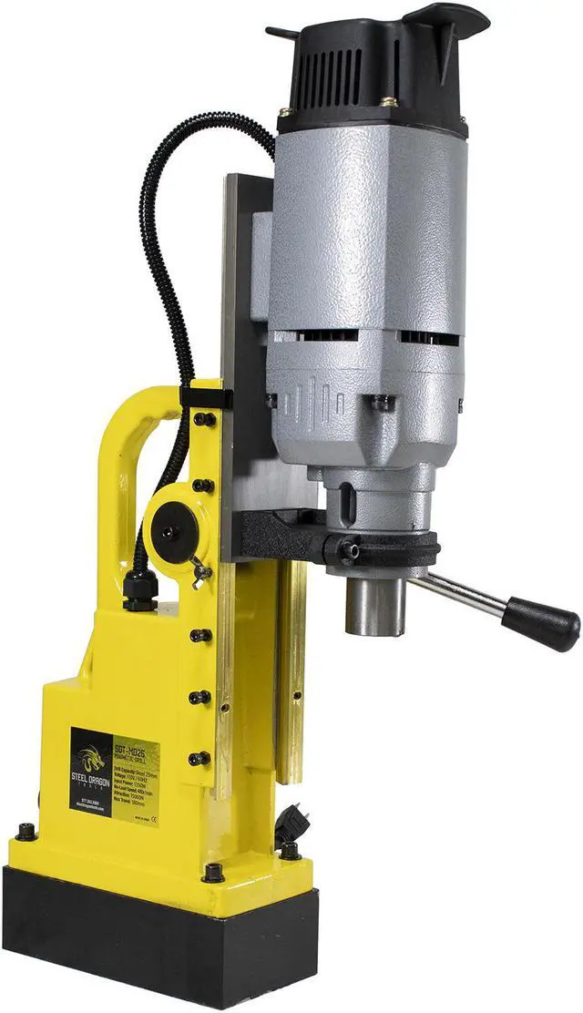 The Steel Dragon Tools MD25 Magnetic Drill Press has 3,372 lbs. of max force to ensure the press will not move during operation. This press will attach directly to the metal surface to drill precision holes quickly and safely. The MD25 has a 1,350-watt motor and offers a maximum boring depth of 7 in. and maximum boring diameter of 1 in. The MD25 has an MT3 spindle taper and comes with an MT3 to MT2 spindle adapter.