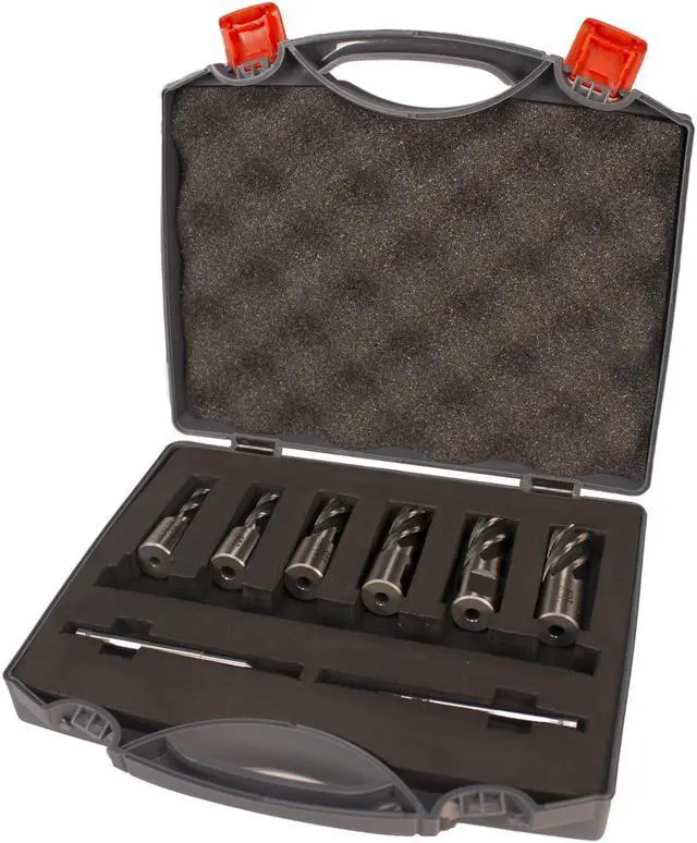 The Steel Dragon Tools® 7-piece high-speed steel annular cutter kit includes six (6) annular bits and two (2) pilot pin. These bits will quickly and safely cut holes in steel. The bits have a 1-inch cutting depth with a 3/4 in. Weldon shank. Bit sizes included: 7/16 in., 1/2 in., 9/16 in., 5/8 in., 11/16 in., and 3/4 in.