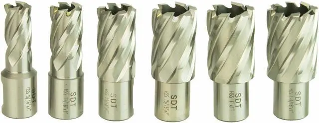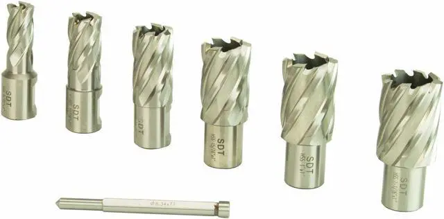 The Steel Dragon Tools® 7-piece high-speed steel annular cutter kit includes six (6) annular bits and one (1) pilot pin. These bits will quickly and safely cut holes in steel. The bits have a 1-inch cutting depth with a 3/4 in. Weldon shank. Bit sizes included: 9/16 in., 11/16 in., 13/16 in., 15/16 in., 1 in., 1-1/16 in.