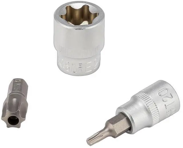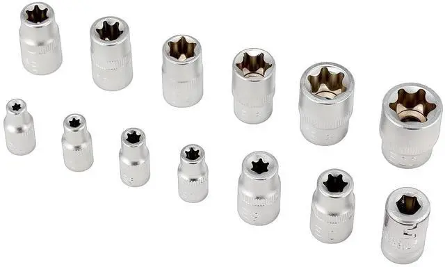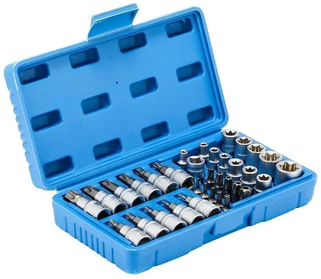 E socket bits have a hole drilled in them to prevent tamper garage. Made of high quality chrome vanadium steel, it is strong and super durable. Combined with chrome vanadium steel sockets, it can provide greater turning power for superior torque. The precisely machined bits ensure accurate size so that chamfered ends insert smoothly into fasteners protecting both edges of bits and fasteners from damaged. All tools in a strong blow moulded storage case that provides convenient storage and transportation.