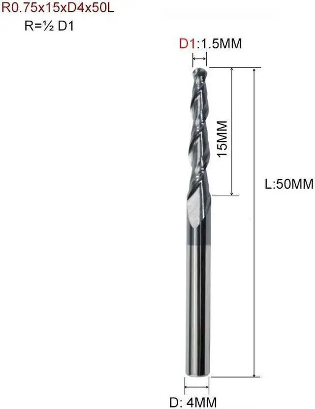 1pc Tapered Ball Nose End Mill Tungsten Solid Carbide Coated Tapered Cone Cnc Milling Cutter R0.75x15xD4x50L