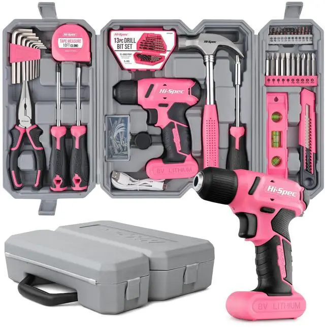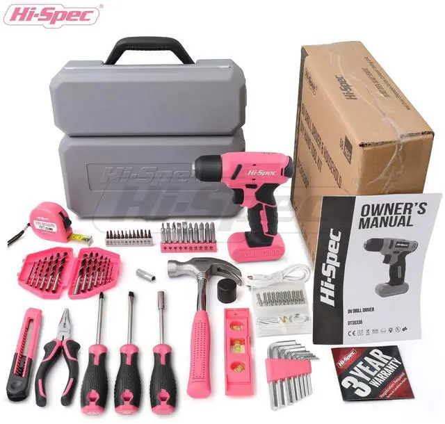 Drill Set 58pc Pink Tool Set 8V USB Electric Drill Driver & Household Tool Kit. DIY Cordless Power Screwdriver-Tool Kit For Home: Complete projects easier with the drill set and essential hand tool kit set - Pink Tool Set: For the apartment or new house owners. Easily screw drive, drill, install, fix and more -Drill Set: Small, lightweight and a soft-grip. Get speeds upto 300rpm, a direction switch & front LED - USB Rechargeable : The USB charged battery powers through wood, plastics drilling & fast screwdriving - Pink Tool Box: The most reached for: Pliers, hammer, tape, Hex Allen Keys, utility knife & more